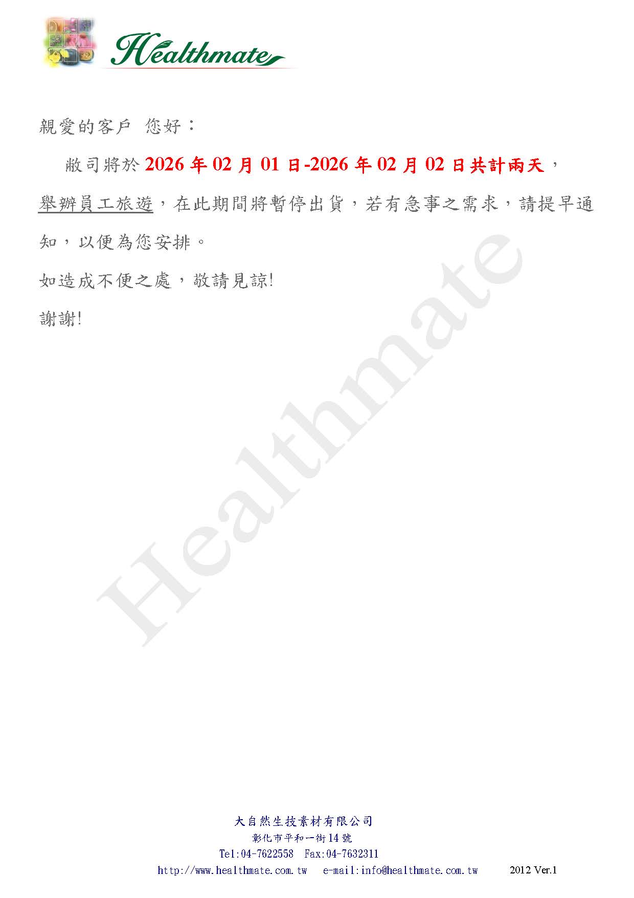 【大自然員工旅遊】 敝司將於2026年02月01日~2026年02月02日共計兩天