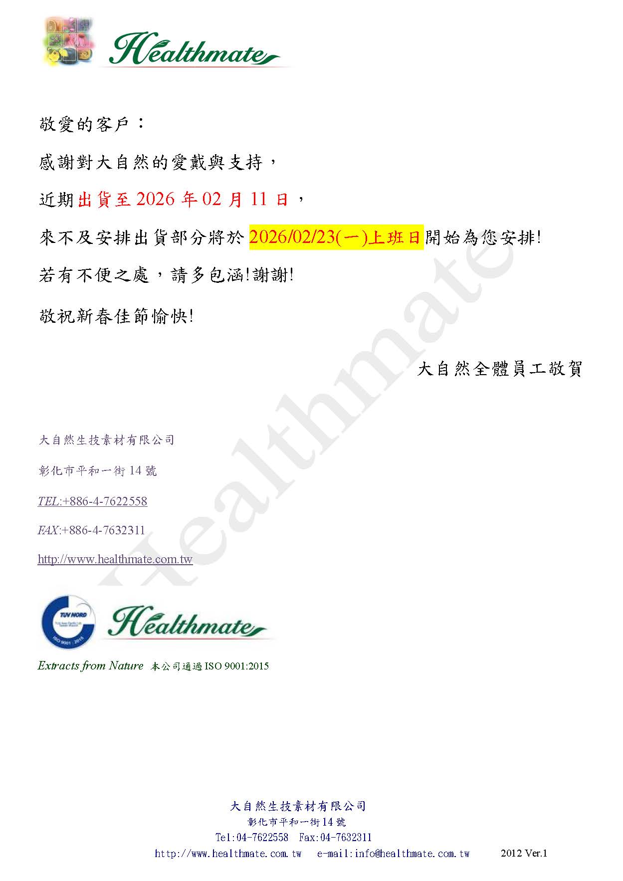 【農曆新年公休】敝司於2026年02月14日-2026年02月22日 休假9天